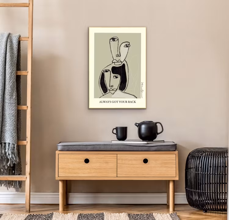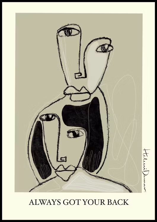 Abstrakt illustration med svarta linjer och former på en lindblomsgrön bakgrund som inramas med ljusgrön kant. Hitta dina nya favoriter bland ByHelenis abstrakta konstverk, ett urval av Helenis personliga favoriter med något som passar för alla. Kombinera postern med ”Freya” och/eller ”Tillsammans” som en perfekt duo alternativt trio.
