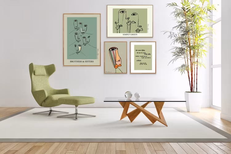 Abstrakt illustration med linjer och former i svart med färgklickar på en grön bakgrund som inramas med lindblomsgrön kant. Hitta dina nya favoriter bland ByHelenis abstrakta konstverk, ett urval av Helenis personliga favoriter med något som passar för alla. Kombinera postern med ”The Clown?” och/eller ”Fri” som en perfekt duo alternativt trio.