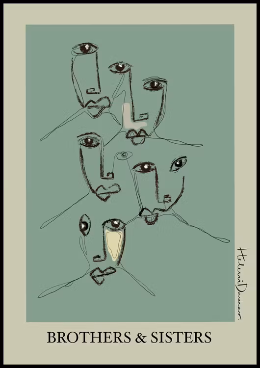 Abstrakt illustration målat med svarta linjer på grön bakgrund som inramas med lindblomsgrön kant. - Vad är syskonkärlek för dig?