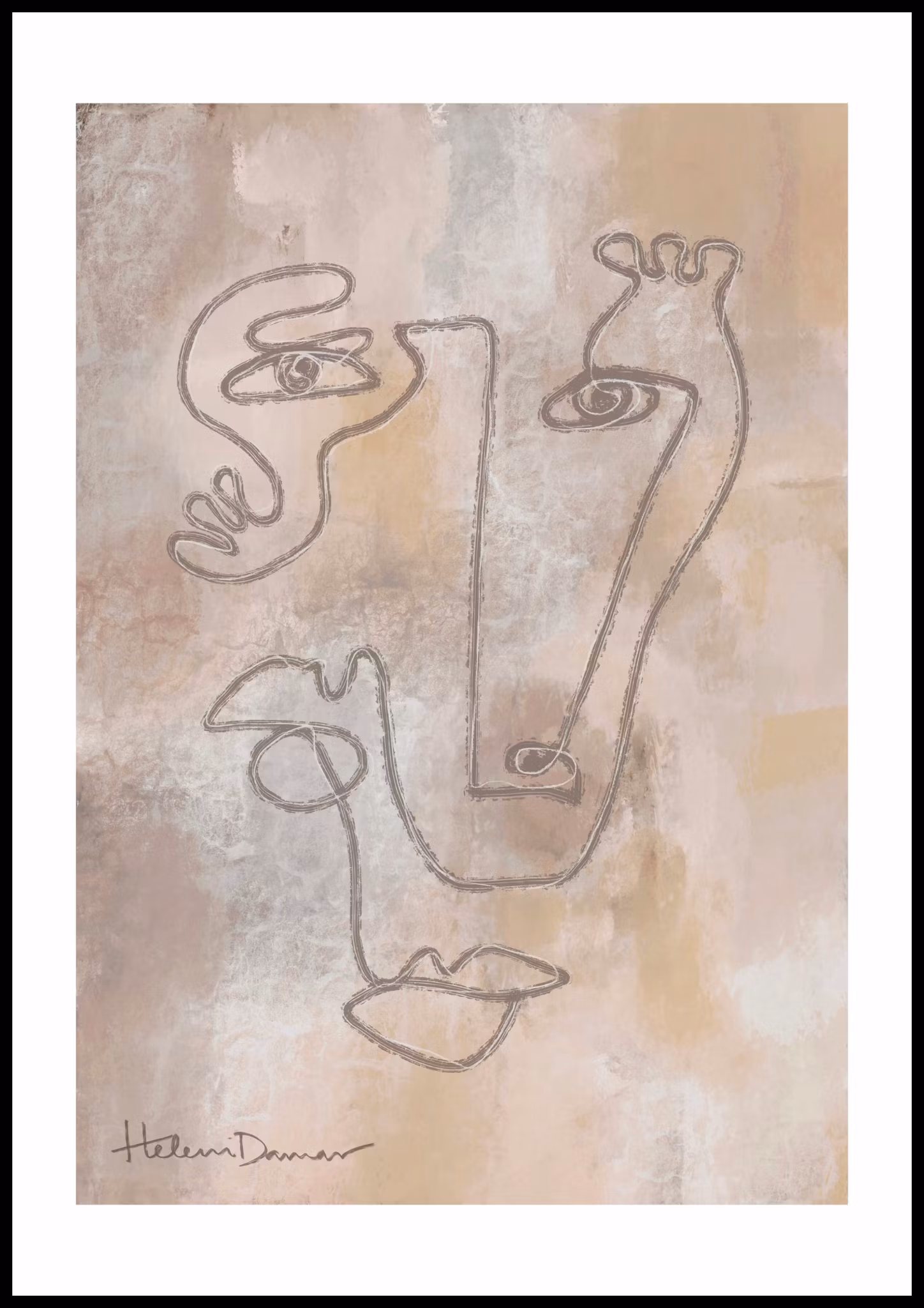 ABSTRAKT ILLUSTRATION AV KONSTNÄR HELENI DAMAR - ABSTRAKTA FORMER - MJUKA LINJER - ABSTRAKT ANSIKTE - VARMA TONER - VIT KANT - BEIGEGRÅ BAKGRUND