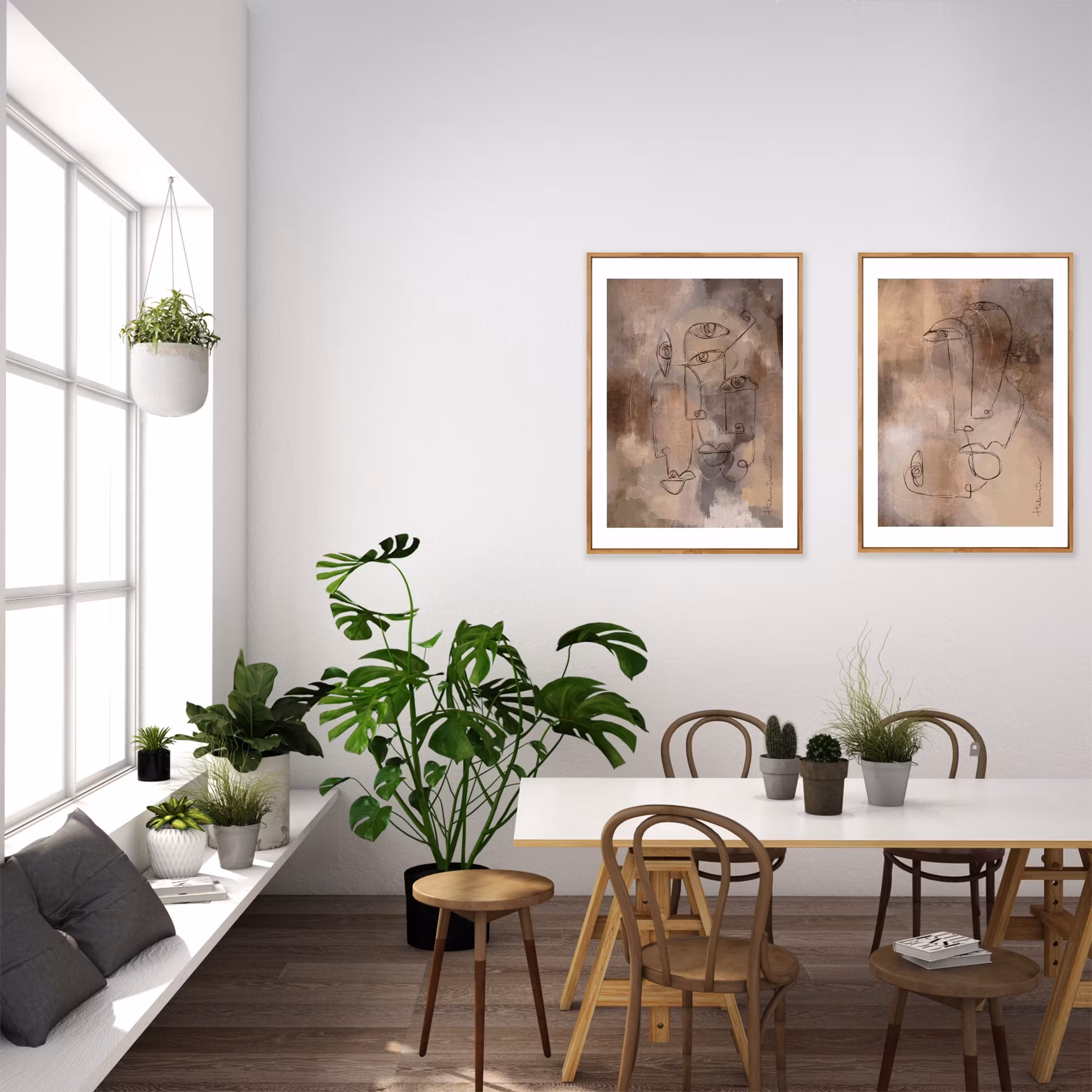 Abstrakt illustration målad med mjuka linjer föreställandes flera ansikten på en bakgrund med varma höstiga nyanser i brunt, beige och grått. Inramas med vit kant.