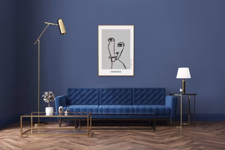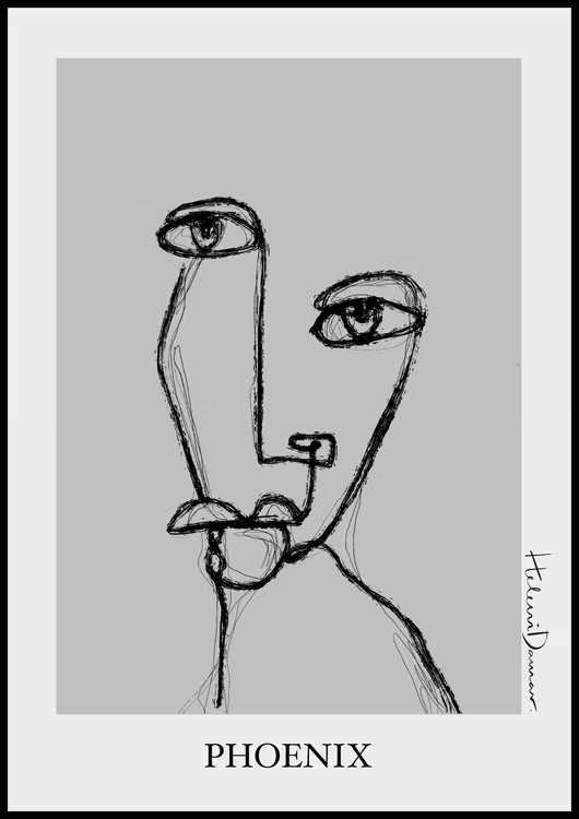 Abstrakt porträtt målat med svarta linjer på mörkgrå bakgrund som inramas med ljusgrå kant. - Lita på oss, denna coola grabb vill du hänga med varje dag!