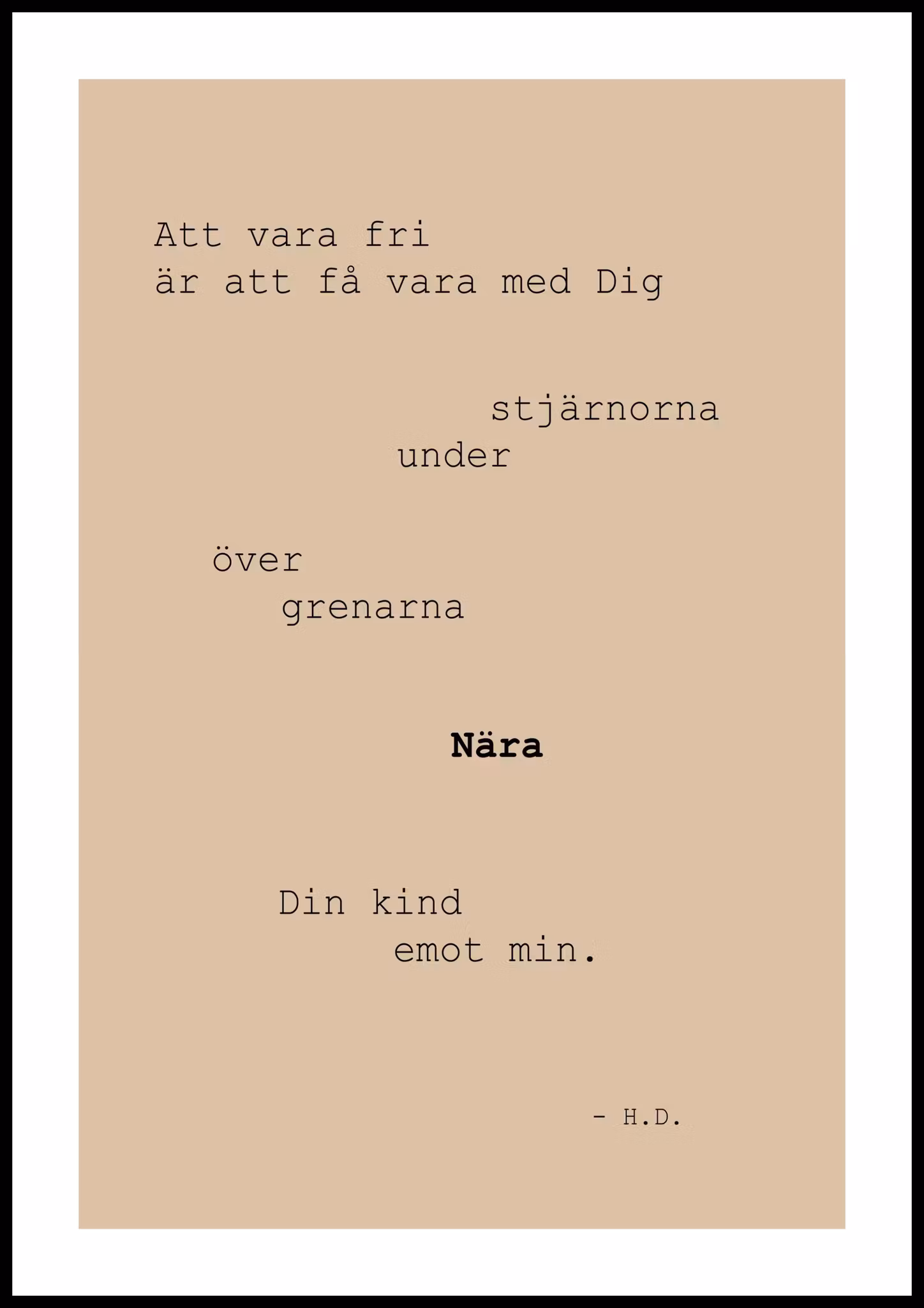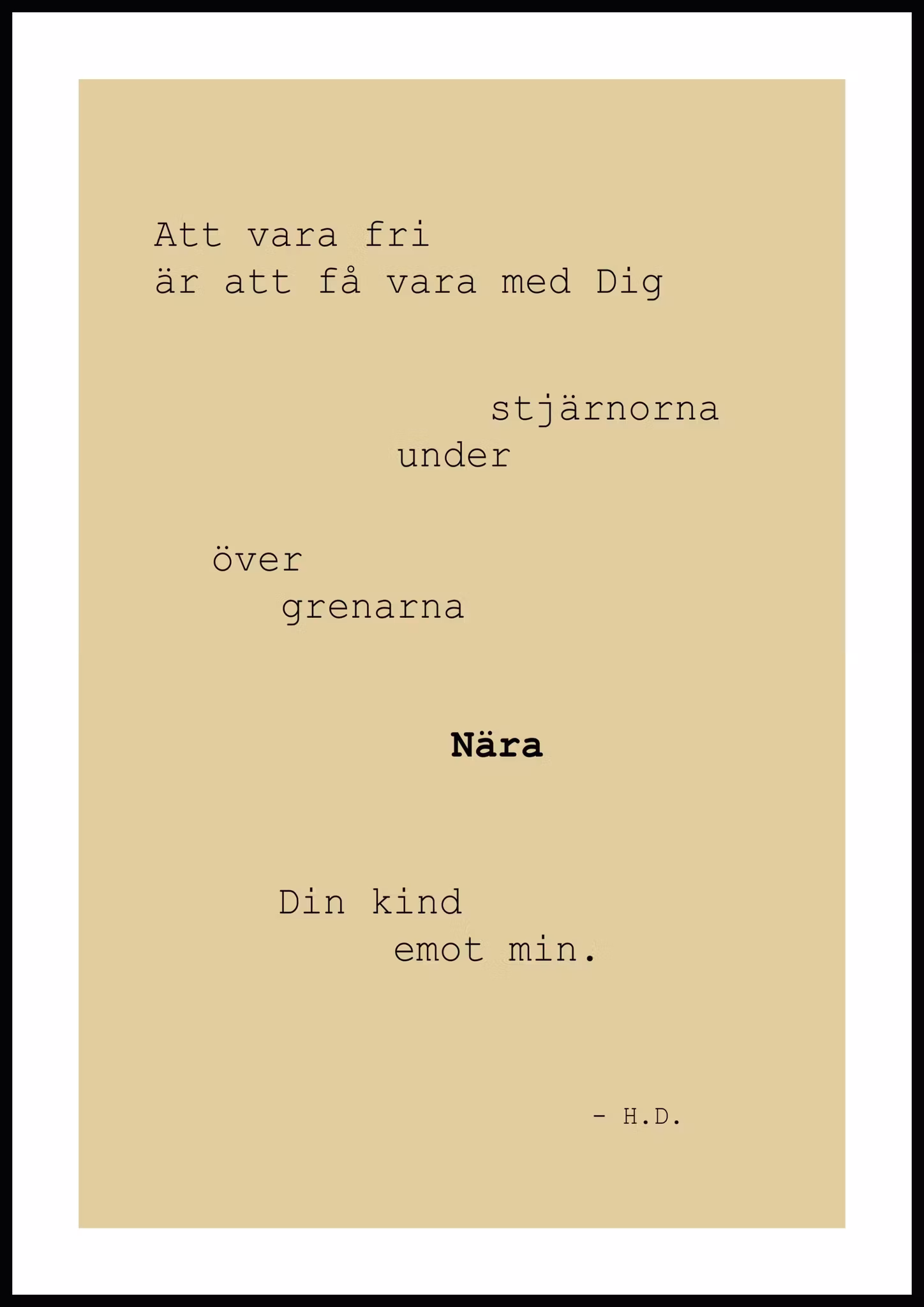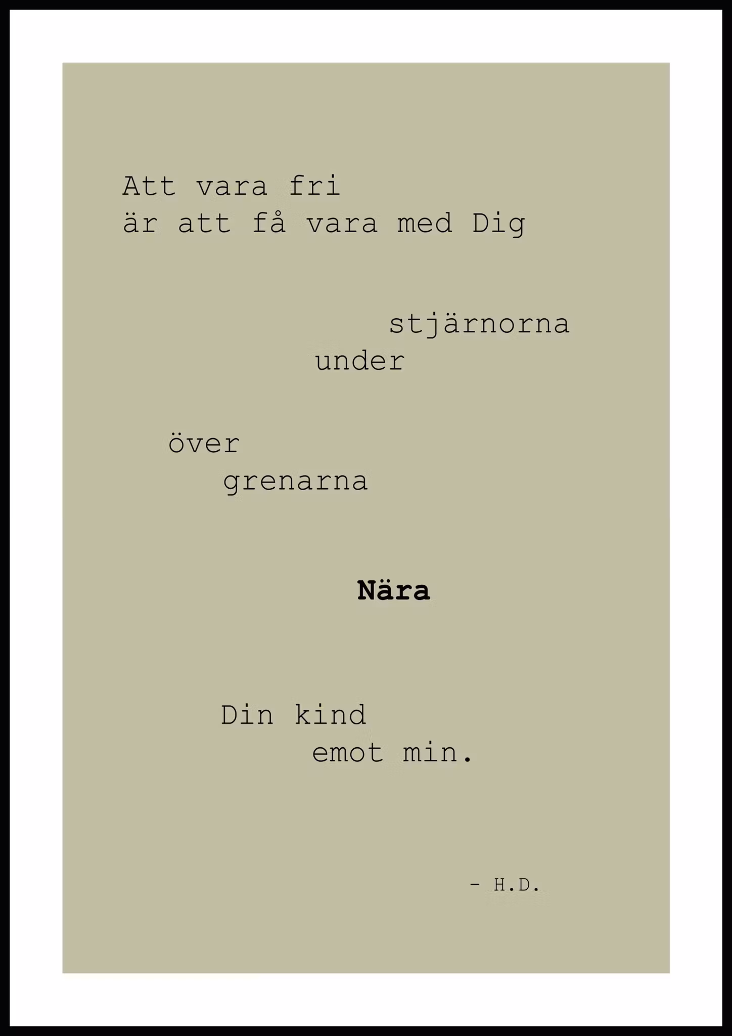 POESI AV HELENI DAMAR - SVARTA BOKSTÄVER - BAKGRUND I GRÖNT BEIGE GULT - RAM I VITT - FRIHET - UNDER STJÄRNOR - ÖVER GRENAR - NÄRA - DIN KIND EMOT MIN