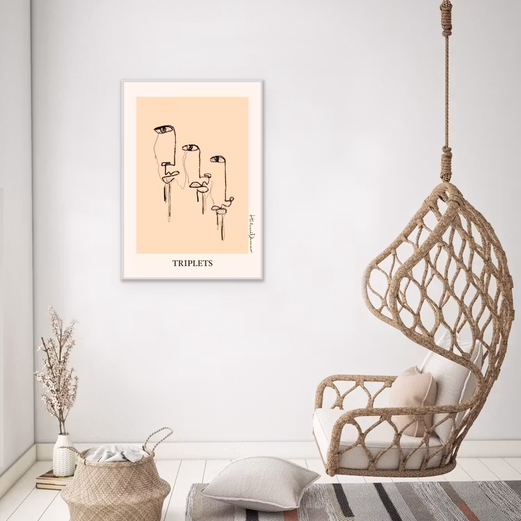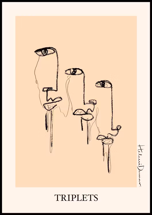 Abstrakt illustration med svarta linjer och former på en rosabeige bakgrund som inramas med ljusbeigerosa kant. Hitta dina nya favoriter bland ByHelenis abstrakta konstverk, ett urval av Helenis personliga favoriter med något som passar för alla. Kombinera postern med ”The Ballerina” och/eller ”Änglar” som en perfekt duo alternativt trio.